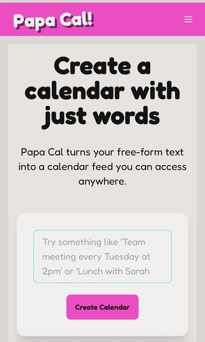 Papa Cal (March 2025). By March of that school year I was so overwhelmed with updates coming out of my kids’ school I thought maybe I could use AI to solve that. The idea is you can just type out your calendar, or copy and paste from a newsletter, or take a picture. Papa Cal creates a calendar feed you add to your calendar. It’s pretty nice, try it out.