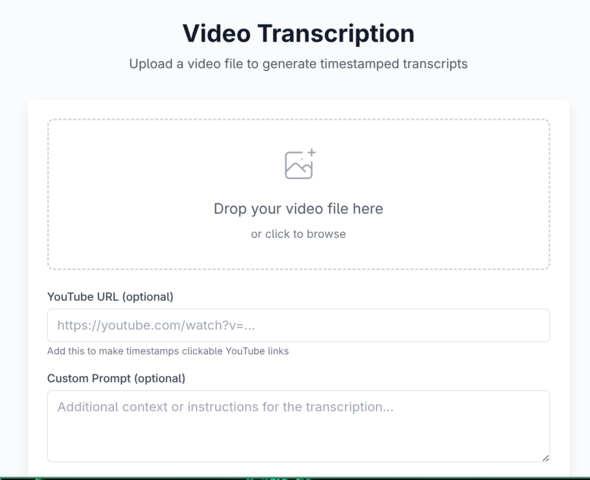 Transcript (June 2025). A very early, nearly pure-vibe-coded application I built for my wife to generate transcripts for videos. Drag and drop a video, the audio gets stripped, sent to Whisper for a raw transcript, then an LLM post-processes it into something readable. Python.